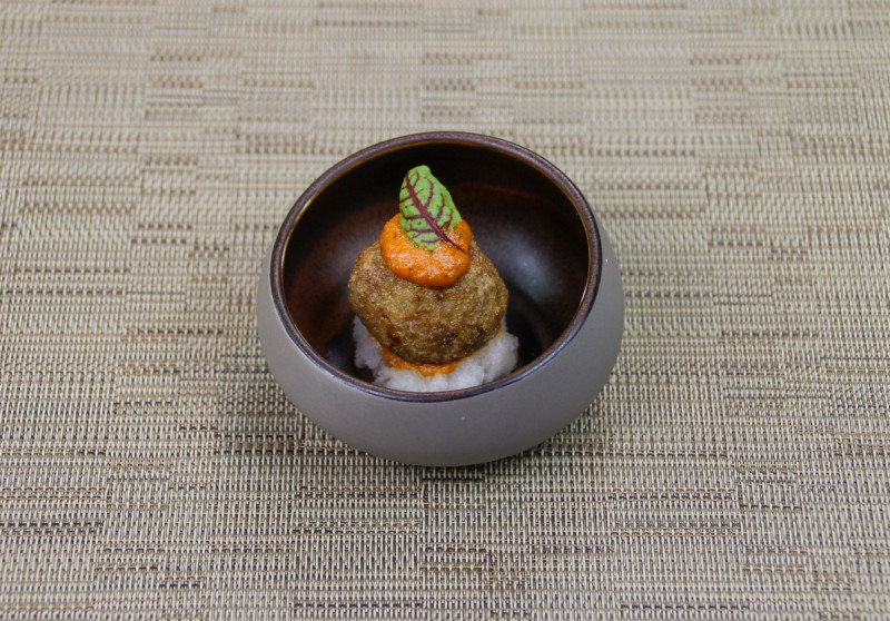 主廚手工牛肉丸,佐以醃漬豆薯與Romesco醬汁,口感多汁豐富。
