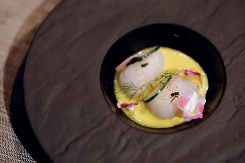 使用當季蔬菜製作成的天然鮮味濃湯,佐以白豆蔻香料泡沫,打造出多層次的口感。