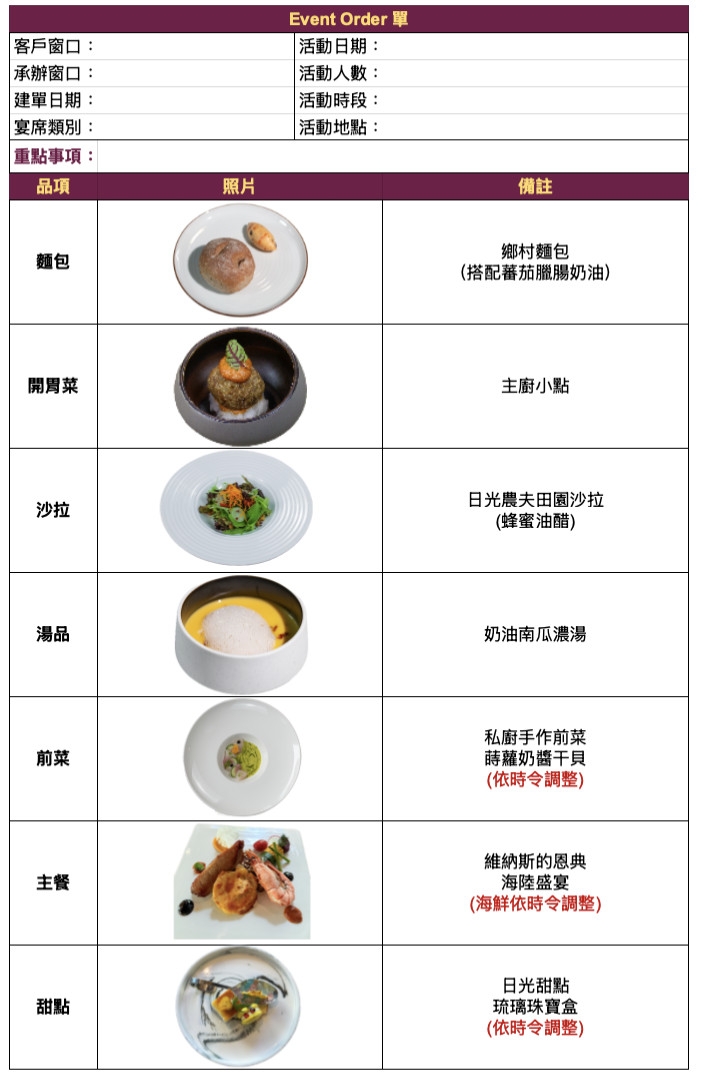 在試菜完成後,日光團隊會為新人建立Event Order單,讓您一目瞭然確認婚禮當天餐點品項,確保婚宴呈現是您最想要的樣子。