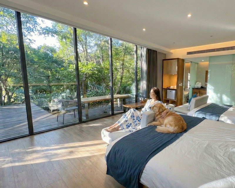 室內環境溫潤舒適且空間寬敞,最大房型可達 22 坪,讓大型犬也能住得自在。這裡非常適合重視隱私、追求安靜度假感的家庭。