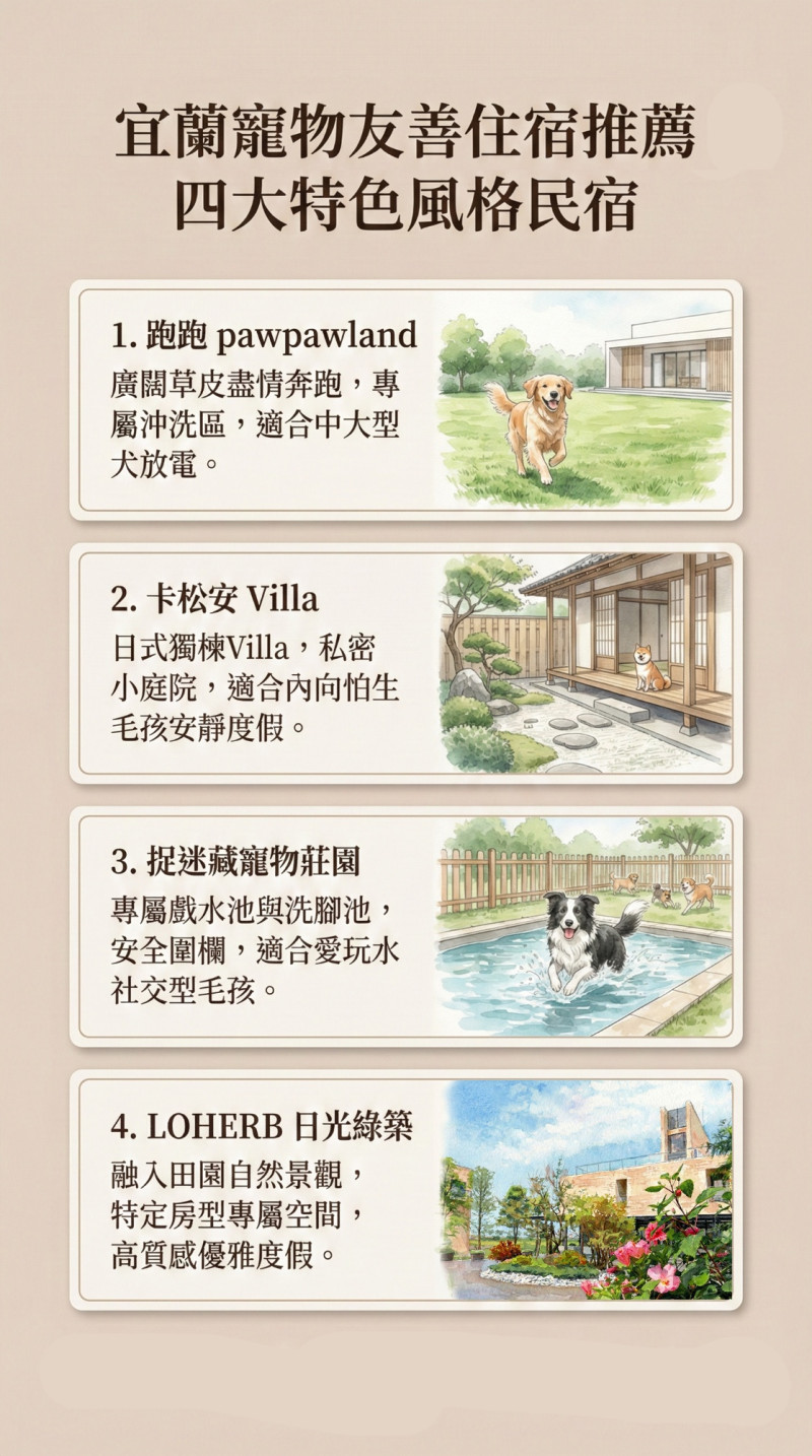 宜蘭坐擁廣闊田野與純淨自然風光,是許多飼主帶毛孩出門放風的首選勝地。然而,一場完美的旅行,關鍵在於找到一間真正「懂毛孩」的住所。為了讓您不再受限於住宿規範,我們特別精選了四間風格迥異的優質民宿——從跑跑 pawpawland 的無邊際草皮跑跳天堂,到卡松安 Villa 充滿禪意的日式度假感,或是捉迷藏寵物莊園 的探索樂趣與 LOHERB 日光綠築 的自然美學,都能讓毛孩自在探索,也讓您在高品質的環境中徹底洗滌身心。-web.jpg)